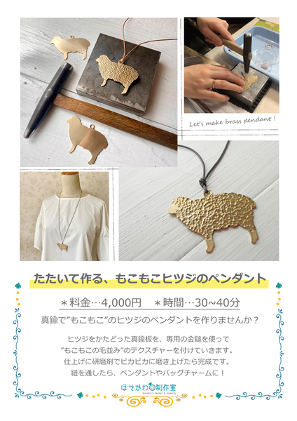注意事項 | ・腕周りや指先の動きやすい服装がおすすめです。 ・ネイルは破損する恐れがございますのでご注意ください。 ・真鍮や銅に金属アレルギーのある方は、参加をお控えください。 |